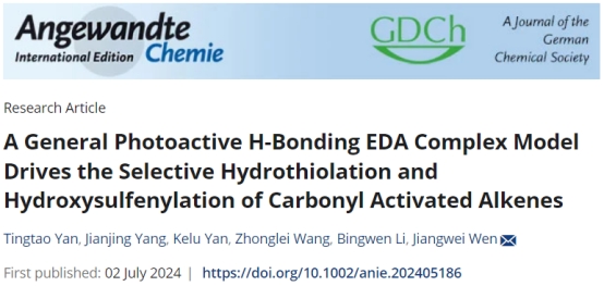 文江伟副教授团队在H-键-S-EDA光化学领域取得突破性进展,相关研究成果发表在国际顶级期刊《德国应用化学》(Angewandte Chemie International Edition)上,论文题为“A General Photoactive H-Bonding EDA Complex Model Drives the Selective Hydrothiolation and Hydroxysulfenylation of Carbonyl Activated Alkenes”,文章链接://onlinelibrary.wiley.com/doi/10.1002/anie.202405186。澳博体育