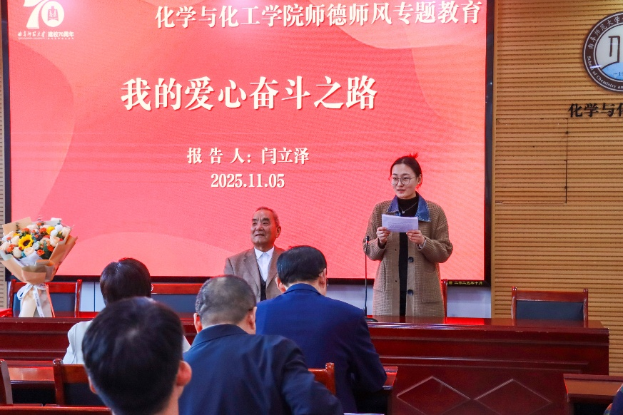 随后的师德师风专题教育报告中,闫教授分享了自己波澜壮阔的学术研究与教育实践历程。闫教授讲到,自己最初是聚焦中学化学实验研究,深入一线挖掘实验教学的价值;随着实践的深入,他开始思考如何通过优化教育实习来提升教育质量,为师范生成长指明方向;此后,他进一步拓展研究领域,投身实验教学论研究,为化学教学理论体系的完善添砖加瓦;在师范教育领域,他始终思索如何培养更多优秀的教育工作者,为教育事业注入新鲜血液;最后,他致力于程序启发教学的研究,力求通过创新教学方法切实提高教学质量,让学生在高效的教学模式中收获知识与成长。