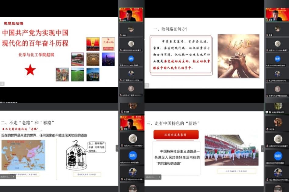 赵琪书记围绕中国共产党为实现中国现代化的百年奋斗历程,从“敢问路在何方、不走‘老路’和‘邪路’、走有中国特色的‘新路’”三个方面对党的百年奋斗历程展开详细讲述,深度剖析了中国现代化建设道路深厚的历史逻辑、深刻的理论逻辑和生动的实践逻辑。赵琪书记表示希望同学们进一步坚定政治信仰,加强政治学习,并将其转化为努力学习的动力源泉,为加快我国社会主义现代化建设、实现中华民族伟大复兴不懈奋斗。