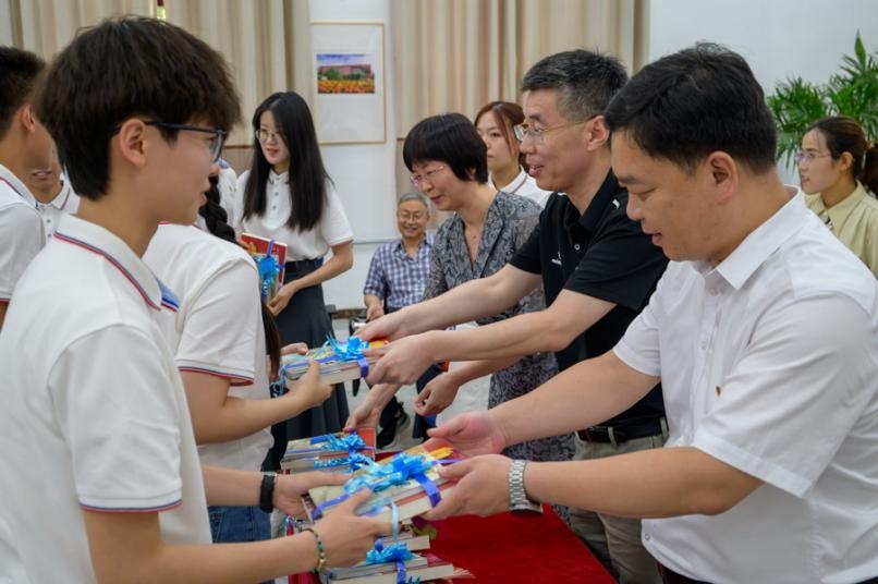图为老师们为学生颁发纪念品