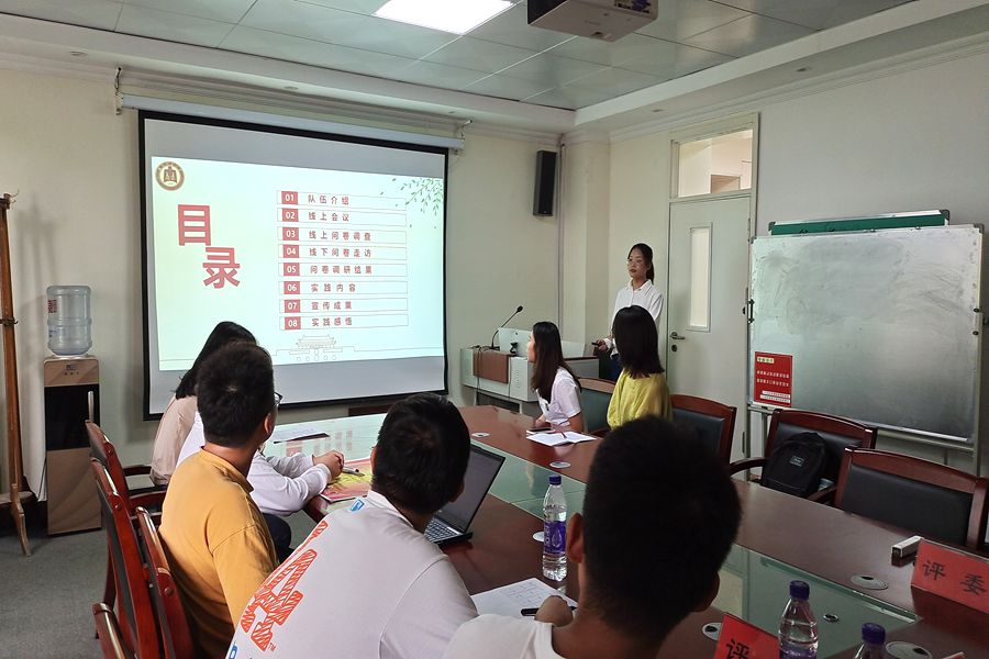 2021年暑期社会实践答辩会顺利召开。辅导员王亚平、黄秉帅,团委副书记苏琦,团委学生会社团联合会副主席楚秀民、社会实践部部长王经洋担任本次答辩会的评委。