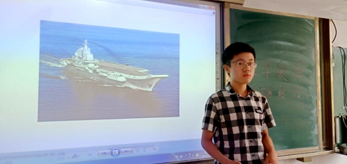 “辽宁舰”是中国人民解放军海军隶下的一艘可以搭载固定翼飞机的航空母舰,也是中国第一艘服役的航空母舰。孙广师讲述了“辽宁舰”的历史、技术装备等,开阔了学生们的视野,使同学们身临其境,他重点分析了辽宁舰对我国的重大意义,激发了学生们的爱国热情。