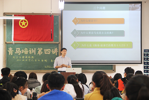 报告伊始,朱斌以“为什么要读经典——以《路易•波拿巴的雾月十八日》为例”为切入点,并结合为什么要读书,为什么要读马克思经典,为什么是《路易•波拿巴的雾月十八日》三个问题深入浅出,生动形象地为学生干部们带来思想上的教育与指导。从如何训练思想,当代最重要的思想、文学的魅力等方面具体讲述当代大学生应如何充实思想,坚定理想信念,成长为一名优秀的青年马克思主义者。他通过讲述身边实例以及列举名人名言的方式, 语言通俗易懂,却富有深刻含义。同学们仔细听取讲课,并及时做好记录,受益匪浅。最后,冯德浩鼓励大家应当多读书丰富自己的内在,增加自己文化素养。在同学们热烈的掌声中,报告会圆满结束。