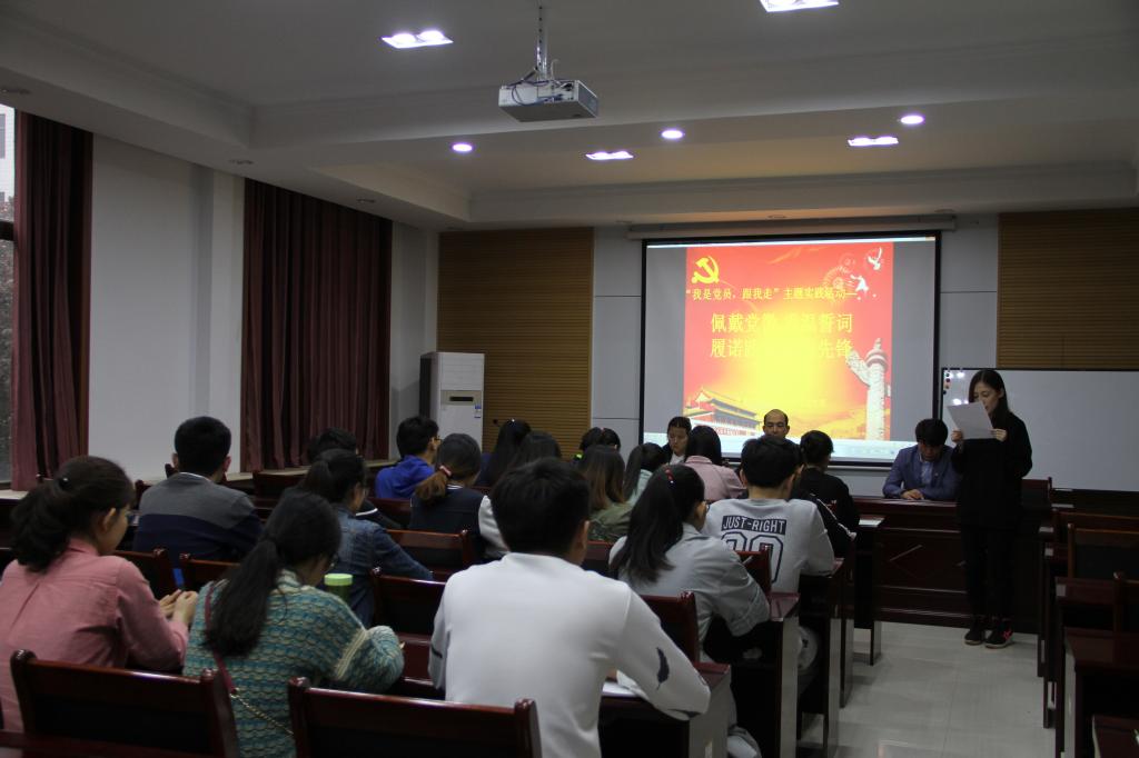 党委关于“我是党员,跟我走”主题实践活动的工作要求、佩戴党徽仪式、重温入党誓词、公开承诺。大会教育引导全体党员要“亮身份、践承诺,多奉献、争先锋”。要把思想建设放在首位,尊崇党章、遵守党规,以习近平总书记系列重要讲话精神武装头脑、指导实践、推动工作,着力解决党员队伍在思想、组织、作风、纪律等方面存在的突出问题。