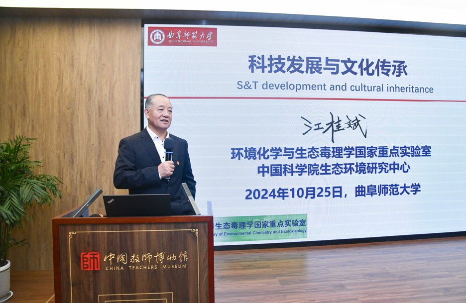 江桂斌院士应邀作了《科技进步与文化传承》专题讲座。江院士从科学家精神开始讲起,分别围绕“从古到今的科技发展”、“古代文明的历史演进”、“儒家思想与治学修身”三个方面,结合历史资料、科研前沿、实践案例、儒家思想等,阐释了科技与文化传承的历史背景和现实意义,重点探讨了基础科学研究的重要性、科技进步对现代文明的贡献、儒家思想和治学修身对教育家精神和科学家精神养成的积极作用等。他指出,在人类历史漫长岁月中,科技一直是社会发展的第一推动力,而中国古代创造了灿烂辉煌的哲学思想、文化艺术、军事战略,在科技水平与技术发明方面长期领先世界。儒家思想在治学修身、文化传承等方面具有重要作用,为我们国家教育科研领域工作者的爱国主义、教育家精神、科学家精神的养成具有积极作用。