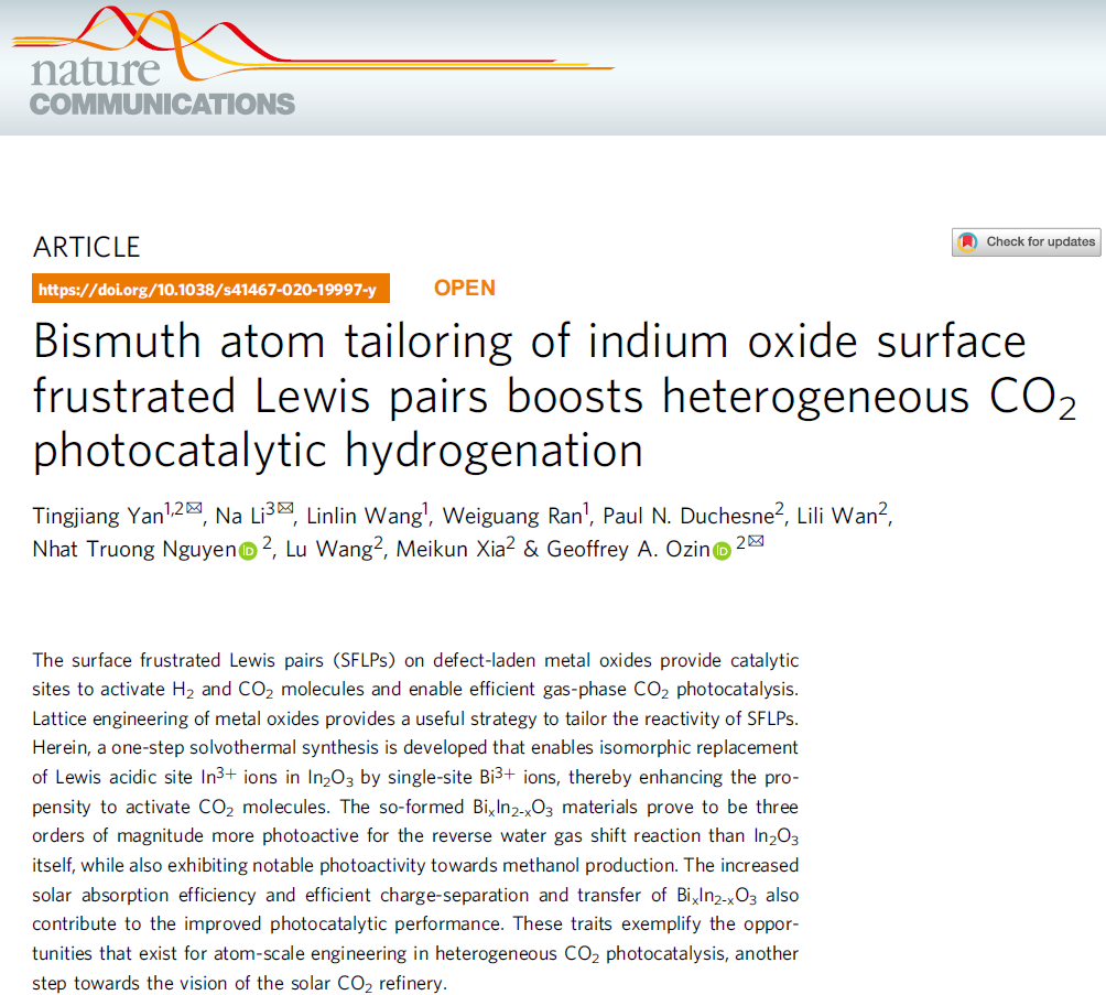 曲阜师大澳博体育讯  近日,曲阜师大澳博体育 颜廷江教授在国际顶级期刊《自然-通讯》(Nature Communications)上发表了题为“Bismuth atom tailoring of indium oxide surface frustrated Lewis pairs boosts heterogeneous CO2 photocatalytic hydrogenation”的学术论文。澳博体育 为论文的第一署名单位和第一通讯署名单位。这是颜廷江教授继2019年在Nature Communications、Angewandte Chemie International Edition等国际顶级刊物发表重要学术成果之后,在太阳能光催化CO2还原领域取得的又一突破性成果。