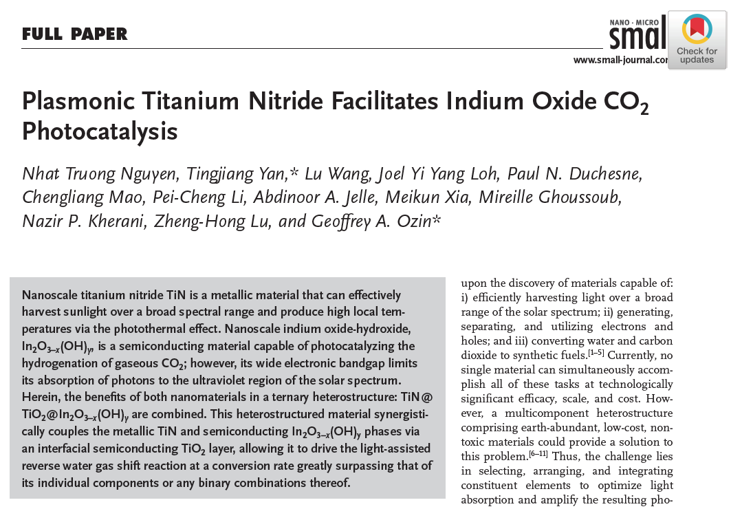 2020年11月,颜廷江教授与Ozin教授继续合作,将SFLPs型In2O3-x(OH)y与具有金属特性的TiN材料耦合,经过煅烧处理后,所得复合催化材料TiN@TiO2@In2O3−x(OH)y可以在较宽的光谱范围内收集阳光,并透过光热效应产生高的局部温度,使其能够以极大超过单个组分或任何二元组分的转化率驱动光激活水气变换反应。相关研究成果以“Plasmonic Titanium Nitride Facilitates Indium Oxide CO2 Photocatalysis”为题发表在国际著名刊物Small(影响因子11.459)。澳博体育 为论文的通讯署名单位。
