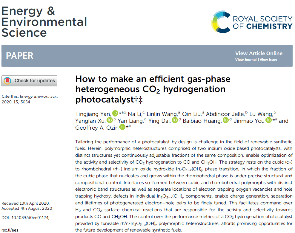 此外,2020年8月,颜廷江教授还基于立方相(cubic,c-)到菱形相(rhombohedral,rh-)氧化铟In2O3-x(OH)y的相变,通过调节rh/c-In2O3-x(OH)y多晶型异质结对CO2加氢光催化剂性能的指标,构建出了新型高效的缺陷异相结光催化剂,对未来可再生合成燃料的发展提供了良好的契机。相关工作发表以“How to Make an Efficient Gas-Phase Heterogeneous CO2 Hydrogenation Photocatalyst”为题发表在国际顶级期刊Energy & Environmental Science(影响因子30.289)。澳博体育 为论文的第一署名单位和第一通讯署名单位。