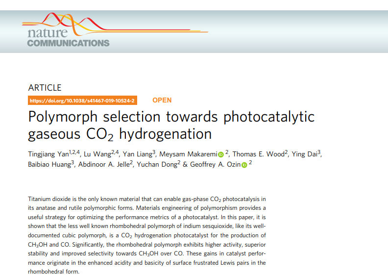 第一篇论文为“Polymorph selection towards photocatalytic gaseous CO2 hydrogenation”(DOI:10.1038/s41467-019-10524-2)发表在《自然》子刊《Nature Communications》上,颜廷江教授为该论文的第一作者与通讯作者,澳博体育