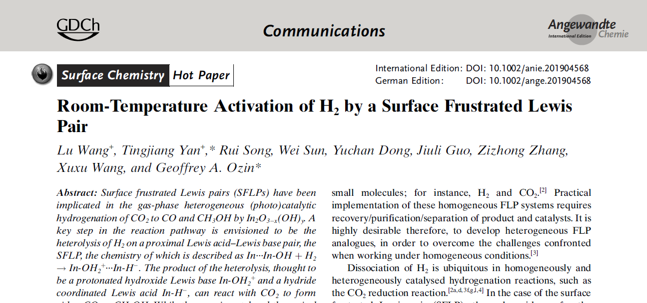 为第一署名单位;第二篇论文为“Room-Temperature Activation of H2by a Surface Frustrated Lewis Pair”(DOI:10.1002/anie.201904568)发表在化学领域顶级期刊《Angewandte Chemie International Edition》,并被编辑选为“Hot Paper”,颜廷江教授为共同第一作者与通讯作者,澳博体育
