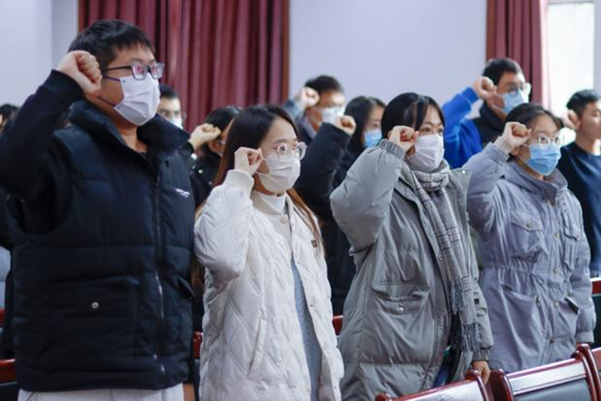 仪式在庄严雄壮的《国际歌》声中拉开帷幕,在李诚带领下,全体党员举起右拳,郑重宣誓。随后,党员代表2019级本科生刘雨菲发言,指出要以身作则,引领带动身边同学,展现党员风采。最后,黄秉帅勉励大家增强党性意识,严格要求自己,热情服务师生,提升综合素质,创造出彩人生。
