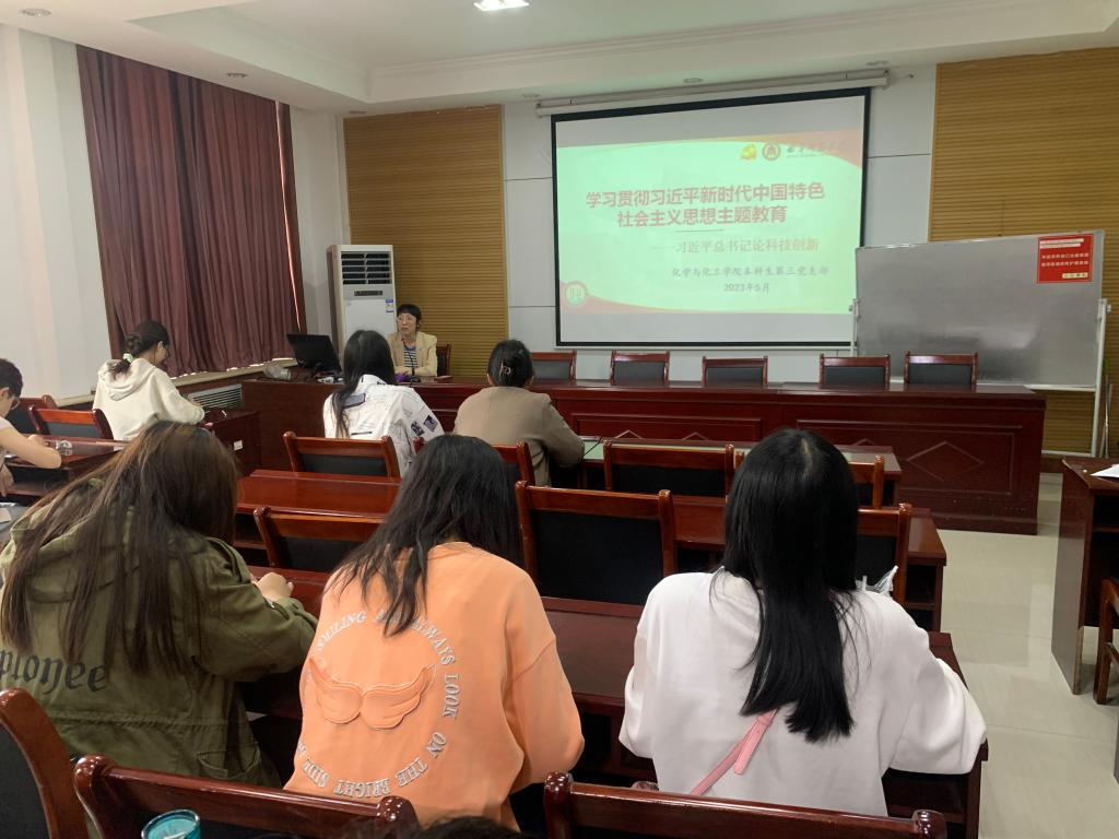 黄秉帅从强调理论学习重要性、科技创新主题教育党课两方面的内容展开。她指出,支部成员需制定主题教育学习计划,并坚定不移地拥护“两个维护”的思想根基,结合实际深入学习习近平新时代中国特色社会主义思想,积极拓展学习形式,用好“学习强国”和“灯塔-党建在线”等网络平台资源。随后,黄秉帅从科技创新的时代背景、习近平总书记对科技创新的重要论述以及科技创新在化学专业领域的重要作用三方面阐述了科技创新是国家强盛之基,民族进步之魂。