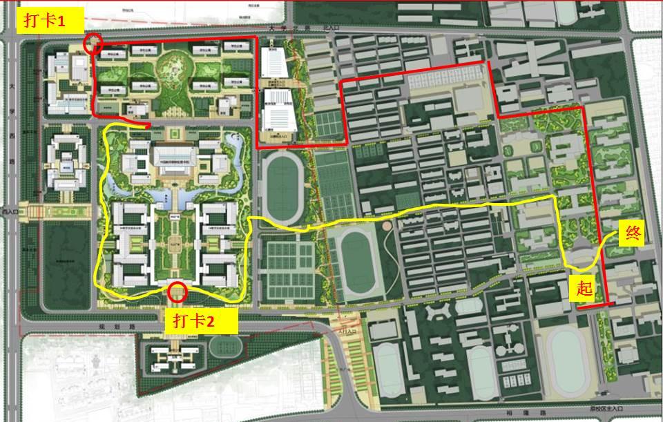 2. 1号打卡点设在新校区西北角(学生宿舍西北角);2号打卡点设在新校区南门。