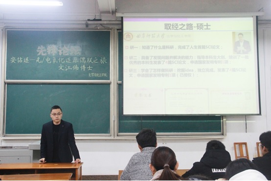 文江伟老师的报告分学术和非学术两部分。在非学术部分,文老师声情并茂地讲述了自己的“取经之路:学士、硕士、博士、博士联合培养”。生动形象地演绎了自己如何从一个“打工仔”到大学生,从一个学渣到研究生的不易之旅。文老师通过自身经历,给在场的同学们提出了三点希望:1、希望大家能够加强身体锻炼,因为身体是革命的本钱;2、希望大家能够努力奋斗,因为收获与付出成“线性”关系;3、希望大家随时做好准备,因为机会都是留给有准备的人。随后,文老师希望研究生同学们能够做到:1、勤奋;2、抵抗诱惑;3、举一反三,要时常问自己的科研是“安:安心工作;钻:刻苦钻研;迷:入迷、痴迷”的什么阶段。