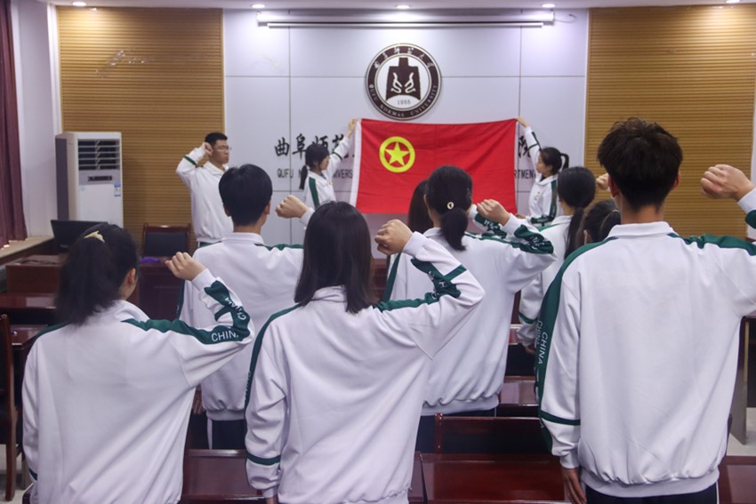 图为本科生团员代表面对团旗庄重宣誓
