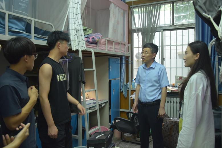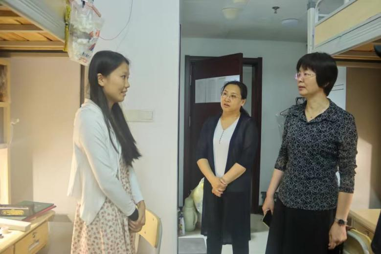 党委书记赵琪,院长冯媛媛,党委副书记孙金玲,2019级辅导员黄秉帅、孙兰馨,2020级辅导员蒋君走访校内公寓二号楼、三号楼,与同学们一一话别,共叙离情。