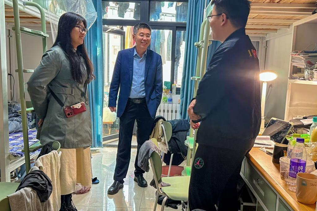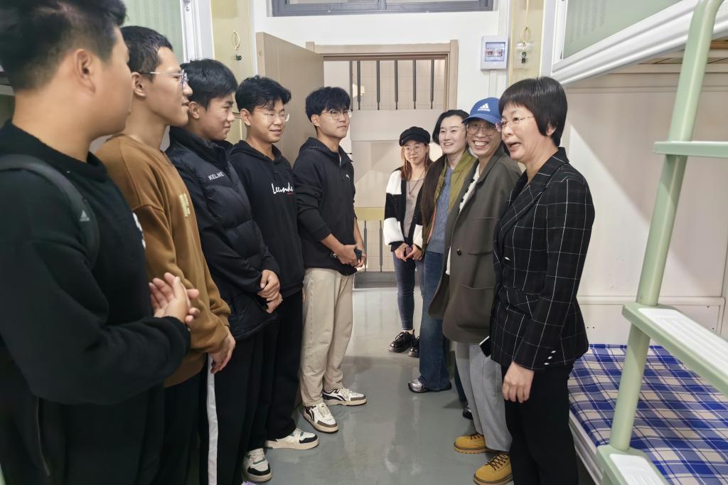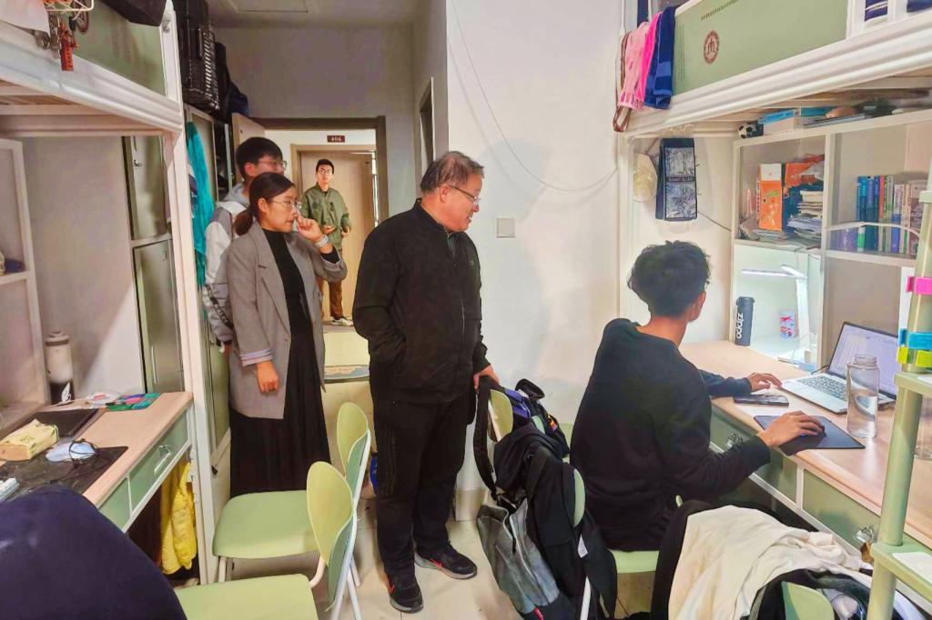 党委书记赵琪、院长冯媛媛、党委副书记孙金玲、团委书记王亚平以及全体辅导员老师前往宿舍进行走访。
