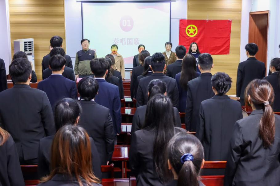 仪式在庄严的国歌声中拉开序幕,全体团员目光坚定、庄严肃穆。