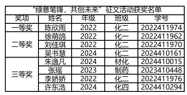 活动自启动以来,同学们踊跃参与,共收到投稿作品132篇,这些作品展现了学子们对环保事业的热忱与思考。同学们以笔为媒,围绕"绿色科技""生态校园""低碳生活"等主题展开创作。本次活动一等奖获得者为陈欣雨,二等奖获得者为徐萌鸽、刘佳琪、吴书慧,三等奖获得者为朱逸凡、张瑶、李娇娇、许东浩。