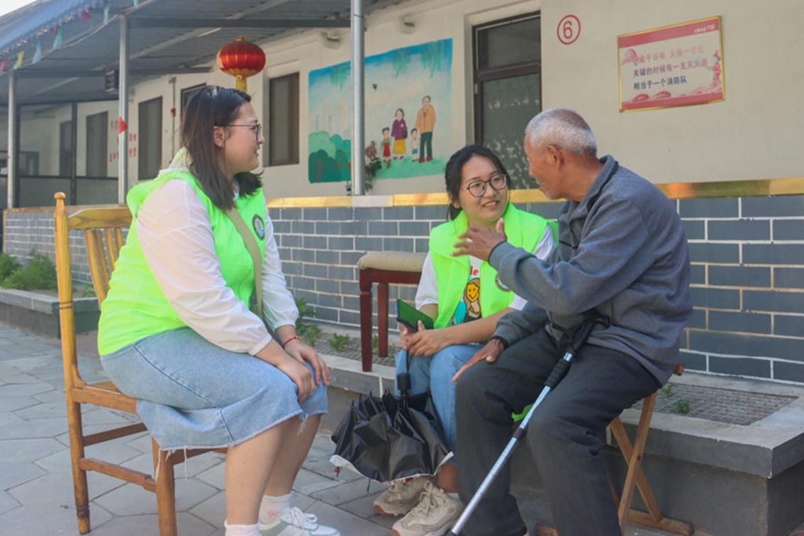 图为志愿者和老人聊天